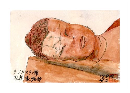 | タジキスタンは中央アジアの一画であるが、私は全く知識を持ち合わせていない国であった。ここでは中央アジア共同館の1つのブースとして配置されている。涅槃像が余りに大きすぎ、タジキスタン館の中はこれ以外は土産売り場だけではなかったかと思う。私の絵も全体像を描くことができなかったので、頭部だけで失礼した。復元した像であるが顔は全ての迷いを断ち切った穏やかな表情をみせている。 |