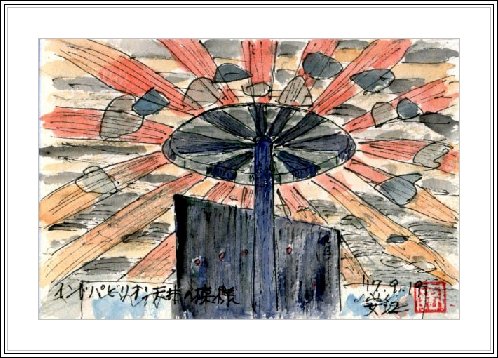 インドパビリオンの2階での光景である。このフロアーは全て織物で飾りつくされており、中央部では紺色の織物が円盤状に張られた後下に垂らされている。天井ではダイダイ色の帯が中央から放射状に張られて、巨大な花を形作っているようである。中間から垂れ下がっている織物は向こう側の映像スクリーンの一部を形成しているらしい。インドの風情を垣間見た感じがした。 |