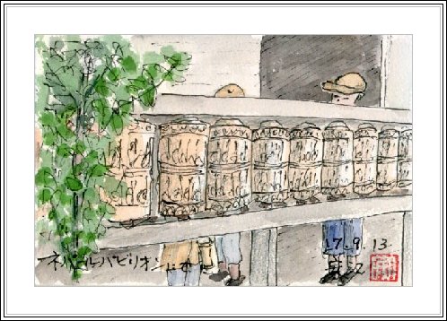 | ネパールパビリオンの間口いっぱいに、入口を挟んで設置された回転体?である。何を意味するものか未確認であるが、これの高さが幼児の目の位置に等しく小さな子供達が思い思いに手で回している。私の孫もここに近ずくとすぐに手回しを始めた。このパビリオンの正面には金色の女神像が建てられており、こちらは入館者の記念撮影に役立っていた。 |