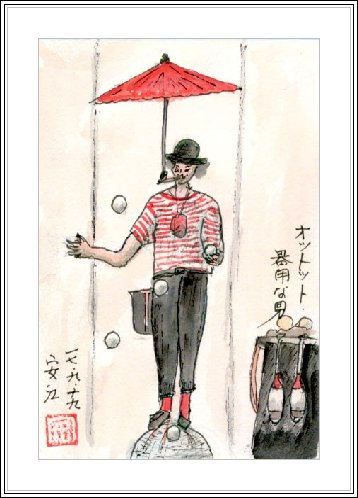 | 手筒花火の打ち上げは万博会場から数km離れた場所で行われ、長久手会場では愛地球広場の大スクリーンで見るようになっていた。私はスクリーンに映し出されたこの姿を記憶しておき、帰宅してから描いた。ベテランの花火師が火の噴出した筒を地面から持ち上げて打ち上げるのであるが、落ちてくる火の粉など美しさを堪能する傍ら、火傷の心配などもよぎった。 | どこのイベントスペースだったかで見かけた光景である。番傘を口にくわえた板に載せて大きなボールに乗り、5個のボールを操っている。 大道芸人の極めつけで、ステージの前は黒山の人だかり。彼の一挙手一投足に拍手したりため息ついたり。残り少ない愛知万博の一こまを描いた。 |
