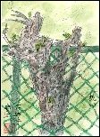 ボランテイア活動でよく出向く活動センター近くの民家に、フェンスを咥え込んだ木を見かけて早速描きました。まだ葉が小さいので木の名前までは確認できませんが、このようにフェンスが幹の中に隠れてしまうほどの木の力に脱帽し、タイトルを「抗い」としました。