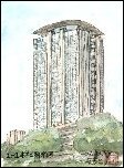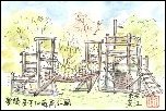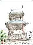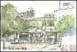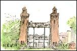 名古屋市中川区の堀川と中川運河の水位を調節するために1930年(昭和5年)に建設されたそうです。門の巾は約9mで約90mに位置してもう1組の門があります。塔の高さは約20mで張り詰められた赤レンガの壁面はエキゾチックな面影さえ感じられます。この門は1968年(昭和43年)に役目を終わり、運河は埋め立てられて一方が小さな公園になっています。新幹線からも良く見えるので、以前から描きたいと考えていてやっと実現しました。