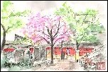 岩倉駅西の商店街前にハナミズキの木が3本あり、うち手前の1本がピンクです。いずれも満開間近ですが行き交う人々はこれらの花にあまり気をとめていない様子です。そして前方には駅から出てくる人を待っているらしい一人の女性。描いている間に赤色の名鉄電車がホームに入ってきました。