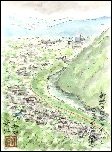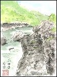 上の絵の後に描きました。手前の岩がライオン岩ですが、こちらは背中を見ていることになるのでライオンの姿を想像することはできません。描いている途中ラインくだりの遊覧船が1艘、菅笠をかぶった観光客を乗せて下って行きました。