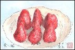 水彩画の会のモチーフにするため買ったイチゴをまず葉書絵に使いました。過去相当多くの果物を描いて来ましたがイチゴは初めてです。タネをどの程度描くか迷い、結局黒い点を並べるのにとどめました。イチゴをモチーフにした水彩画は5月17日に先生の指導で描きました。