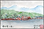 この絵は清水港ミニクルーズの船上からのスケッチです。清水港は工業製品などの輸出入が多く、ここで描いたものは港の北部にある新興津コンテナターミナルの遠望です。小さくて判別できませんが数基の巨大クレーンの下に赤いコンテナが積み上げられている様子です。この日は空も晴れ上がり船から見える港の景色に癒されました。