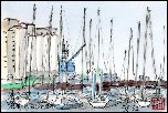 この絵はエスパレス・ドリームプラザに隣接するヨットハーバーです。多くのヨットが巨大な倉庫をバックにして、帆を降ろしてまどろんでいるという状況です。清水港は横浜港・長崎港と並んで日本の三大美港と言われているそうですが、ここは港の中心に三保半島を擁してバランスよく整えられているためではないかと思います。ただ港から見えるはずの富士山が雲で覆われて見えなかったのは残念!
