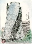 ゴールデンウイークのさなか、友人との待ち合わせのひと時を名古屋市内笹島交差点で描いたものです。この建物は「モード学園スパイラルタワーズ」といい、2008年3月26日完成した地上170mの36階建てビルで大きくねじれた形状は衆目を集めています。大変奇抜で複雑な形状のため、描く者にとっては根気が要求されます。描いている途中、赤信号で止まったタクシーの運転手さんがドアのガラスを下ろして覗き込み、感動してくれました。