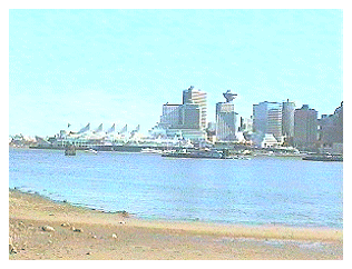 | 地上167mの展望台。バンクーバーが一望できる | この写真はバラード入江のほんの一部。カナダ・プレイスは大型帆船 の形をした国際会議場や展示会場 | ||