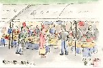 22日朝の朝市の一こまです。地元直産の野菜や漬物などが安く売られていました。前日の盆踊りの疲れもどこへやら、この絵を描き始めてしばらくの後ほとんどの品物は売り尽くされていました。私の仲間もかなりの量の野菜などを買い込んで帰ったようです。 |