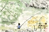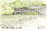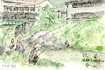 この絵は翌日朝投宿した旅館の窓から描いたものです。前日までの雨でかなり水嵩が増した中、一人の釣り人が静かに糸を垂れていました。 |