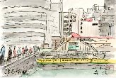 市ヶ谷での午後の講演会まで多少の時間が合ったので、JR市ヶ谷駅を神田川の向こう側から描いてみました。丁度昼休みの時間帯でしたが、総武線の黄色い電車がホームに止まった光景に出会うことが出来ました。もっとも総武線は数分毎に通過しているので、この1枚を描く間に4〜5本の列車が通過していることになります。 |