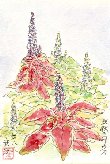 自宅前の遊園地の花壇にたくさん咲いています。紫蘇の系統と思われますが、葉の中央部と縁の色の組み合わせがさまざまで、しかも鮮やかすぎるので見ていると却って蒸し暑さを感じさせられます。この絵は朝描きましたが立秋とは言え暑さが身にしみてきました。 |