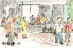 月曜日朝の渋谷駅前です。出勤のラッシャワーは過ぎておりますが、人々は暑さから逃れようと足速にいずこかへ消えていきます。正面の若者は地下道出口の塀に座って朝飯を食べながら話し込んでいます。この絵を描いている私も早く日陰に入るべく焦っているところです。 |