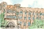 この病院は東京大学本郷キャンパスのすぐ東側に面しています。私がここを題材にしたのは、あるガイドブックにレリーフ(この絵の左側玄関の上部)について紹介されていたためで、レリーフには高名な医学者や研究者がそれぞれ熱心に活動している姿が刻まれています。おそらくこの病院では多くの日本医学の第一人者が活躍しておられることだと想像しながら描きました。 |