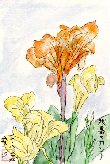 妻が友人から頂いて庭先に植えたカンナが、見事な花を付けています。肥料をふんだんに与えたこともあり、葉ばかりがやたら大きくなって開花が多少遅れたようです。カンナは夏から初秋にかけての代表的存在で咲いているときは豪華な感じを受けますが、しぼんだ物は枯れた花びらがこぶこぶの種子に付着して垂れ下がるという、あまりいただけない姿を見せてくれます。 |