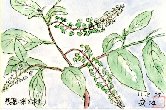 この花は私の庭に自生した雑草で、植物図鑑に寄れば「洋種山牛蒡(ヨウシュヤマゴボウ)」という植物だそうです。未だ小さな苗のとき妻がケイトウと勘違いして残しておいた処、成長してこのように小さな白い花から次第に緑色の粒になるぶどうの房に似た穂を付けてきました。この粒は最後に黒く色づくらしいのですが、1ヶ月以上にもなるのにまだ次々と新しい穂が増えるのみで本当の実は見られません。 |