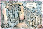 サントリー白州蒸溜所では「仕込み」・「発酵」・「蒸溜」などの工程を経てモルト原酒が造られます。この絵は蒸溜釜を写真に撮りそれを転写したものです。大小の蒸溜釜が数多く並んでいて絵にするのは厄介でしたが、思い出造りには大変役立った作品になりました。 |