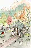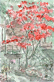 郡上八幡といえばまず盆踊り、2と3がなくて4に八幡城くらいでしょうか。しかしここにこのような公園があることを初めて知りました。この絵はほんの一部を描いたものですが公園はかなり広く、園内に鳥類を飼育している鳥屋もあって家族づれには人気がありそうです。この絵のようにバックの緑に真紅の紅葉が印象に残っていますが、ほかの所では狂い咲きと思われる桜の木もあり、入園者の関心を引いていました。 |