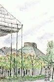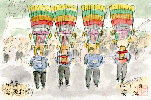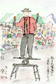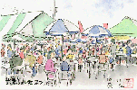 この日は天候にめぐまれ、暖かかったこともあってかなりの人出でした。テントの下はこのように家族連れが食べたり飲んだりし、不景気を忘れたひとときであったかも知れません。描いていると何人かは覗き込み適当なお世辞?を言って去っていきます。葉書絵を描いている自分はここでは多少場違いな感じでしょうが、本人は悦に入っているのです。 |