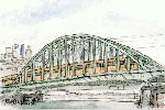 隅田川にかかる総武線鉄橋で長さが1708m あり,昭和7年(1932年)に完成したものだそうです。我が国初のランガー桁鉄橋というのだそうで素人の私にはわかりませんが、どうやら橋桁を上部のアーチから吊っているもののようです。総武線の列車数が多く、この絵を描いている間に何本かが通過しました。 |