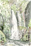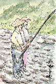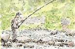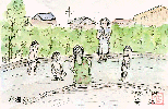 上と同じ場所での情景です。こちらは糸を垂れる人と水面を見ながら何かを語りかけている人の表情を描いたつもりです。この日は「海の日」で夏休みの間の3連休でもあったため、奥美濃のこのあたりは家族連れで非常に賑わっていました。とくに東海北陸自動車道の開通によってますます増えているようです。 |