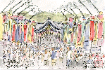 神社の境内がこのように七夕飾りで埋め尽くされて、あちこちで屋台が軒を連ねて大勢のひとたちが行き交い、スピーカーから放たれるまつり囃子の喧騒などは、このお宮さんの普段の静けさからは想像もつかない光景でした。 |