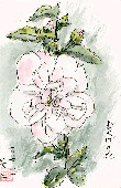 むくげの花も最近は種類が増えています。この絵は犬山市の小公園の生け垣で写生したものです。清楚な感じの花と葉の緑を対照させてみました。 |