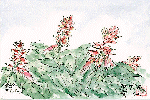 サルビアは最近は何処ででもお目にかかれますが、この様な斑入りのものはまだ珍しい種類です。自宅前の遊園地の花壇にたくさん植えられています。この絵を描いたときは花の部分がまだ15センチ程度でしたが、現在ではその倍近くになっています。 |