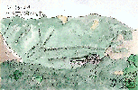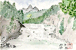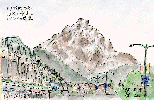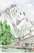 ボウ川にかかるカスケイド・ブリッジの下から見たカスケイド山で、バンフ滞在の最後の絵です。この絵にはありませんが川の対岸の芝生では、水着姿の若い女性やヒッピー風のグループなどが思い思いの格好で暑さをしのいでおり、避暑地ののんびりした光景を目にしてバンフのたたずまいを感じました。 |