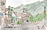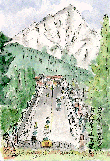 バンフの中心から南のボウ川方向を見た絵です。バンフ大通りをはさんで沢山のみやげ物屋やレストランなどが立ち並び、多くの観光客が行き交っていました。この街には大橋巨泉さんが経営する「OKギフト」があり、店内は日本人客で相当な賑わいを見せていました。 |