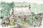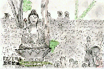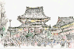 JR山手線目黒駅から徒歩数分にあるこのお寺は1620年代・寛永の初めごろに創建されたものの、江戸時代に江戸大火の火元となって全焼し幕末のころに再建されたとのことです。境内には火災の犠牲者供養のために建立されたと伝わる五百羅漢が並んでおります。この絵ではひときわ目立つ座像を中心に描いたものですが、背後のたくさんのお地蔵さんもよく見るとそれぞれ個性が感じられます。 |