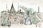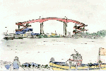 川崎市と千葉県木更津市の間を海底トンネルと橋で結んだ全長約15.1kmの「東京アクアライン」が一昨年暮完成し、海底トンネルと橋がつながる部分に「海ホタル」と名づけられた人工島があります。この絵は島の中央部を描いたものです。3連休の初日でしたが人出はまあまあという感じでした。天候が良ければ東京湾や羽田空港なども一望でき、一度は訪れる価値があると思います。 |