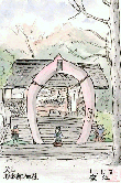 犬山市北端の木曽川に面して位置するこのお宮は、童話をもとに造られたもので子供の守り神としてこの地方ではよく参拝されています。境内には家来の犬・猿・キジを交えた種々の置物が配置されており、この絵中央の馬蹄形の門は桃をあしらっておりますが、後方の本殿の古風?な建物とはちょっと不釣り合いなのが一興です。 |