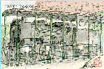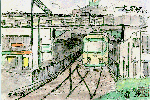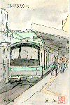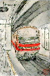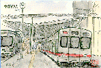 「名鉄電車・特急(新名古屋駅)」:(1997.5.17) 名鉄電車は近鉄とともに私の通勤の足です。この新名古屋駅は名古屋本線、犬山線、常滑・河和線・津島線など多くの線が通過しているのにホームは地下式で、レールが上下各1本しかないため朝夕のラッシュ時には1〜2分間隔で発車します。乗降客は「?」です(今度調べておきます)。この駅を通過する特急電車は1時間に約10本ありますが、全く同じ型の電車が続いて来ることは少ないので描いている途中でモデルが変わってしまい、ニューモデルの絵が出来上がりました。 | |