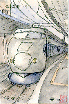 「東海道新幹線(名古屋駅)」:(1997.5.17) 私は名古屋・東京間を毎月6〜7往復しており、新幹線を描きたいというかねてからの希望がやっと実現したのがこの絵です。普段先頭車両をじっくりお目にかかることは全くないので、ホームへの入場料140円を支払ってしっかり観察しました。ホームの最先端には(どこの駅でも同じですが)運転士の控え室があり、私が描いている間何人かの運転士が横目で一瞥していきました。ただし「ひかり」は名古屋駅で2分程度しか停車しないので、この絵は5分停車した「こだま」にターゲットを置いてt書き上げました。 | |