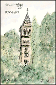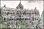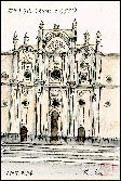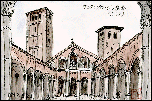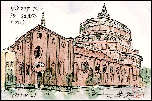 「サンタンブロージョ教会(ミラノ)」: (1997.9.29) 4世紀に完成した、市内最古のロマネスク様式の教会です。9・12世紀にはアナトリウムや鐘楼が建てられ現在の形になったとのことです。私が入り口のところでこの絵を描いている間、後ろで子供をあやす女性の声を耳にしましたが、描き終って動き出したところその母親が私に手を差し出し物乞いしてきました。日本では体験できない光景です。 | |