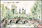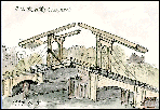 「マヘレ跳ね橋 (アムステルダム)」 : (1997.10.3) 何百とあるアムステルダムの橋のなかでも「マヘレ跳ね橋」は有名です。1671年建築家マヘレによってアムステルダム川に架けられたものだそうです。この小さい木の橋は大型船が通過するたびに人力で動かされているという、都会の真ん中にありながら何とのどかな光景ではありませんか。この絵を描いている途中で橋の「跳ね上げ」を見ることができました。 |