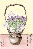 「母の日プレゼント(奈美子さんより)」:(1998.5.10) 東京・葛飾区柴又に住んでいる長男の嫁さんから今年も「母の日」のプレゼントが届きました。名前はわかりませんが紫の可愛い花で、嫁さんのアイデアですべて紫に統一したとのことです。早速描きましたので近日中に彼女に贈る予定です。花は妻が鉢植えにして玄関脇に置きました。 | |