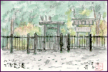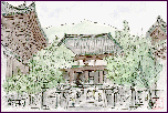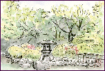 「龍潭寺庭園」:(1998.5.1) このお寺は浜名湖の北部にあり、天平7年(733年)に行基菩薩によって開創された古刹です。庭園は小堀遠州の設計により江戸時代初期に本堂北庭として築かれたもので、国の指定文化財です。この絵は本堂から左手方向を眺めて描いたもので、庭園はごく一部しか出ていませんが、全体は数多くの石組みによる滝・渓谷と、さつきやどうだんつつじが調和した明るい感じの庭です。 | |