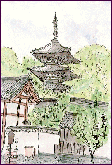 「當麻寺・三重塔」:(1998.5.4) この當麻寺には東塔と西塔の2つの三重塔があり、天平時代の優雅な建物です。この絵は東塔だと思います。背景の木々の緑とも良く調和しています。 | |