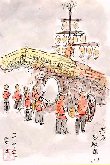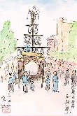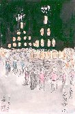 絵を描いている間に夜8時を過ぎてしまいました。この頃になるとあちこち単独移動していた山車がまとまって移動を始めます。この絵は2基の山車を描いたものですが、提灯が暗闇の中で動いている光景です。「石取祭」の歴史については全く無知ですが、このお祭りが地元の商業祭の一つで、これのために町内会や商店街から膨大な費用が支払われているとの事で、いつも利用しているタクシーの運転手さんによれば、中には金が払えなくて直前に夜逃げした商店主もたまにあったらしいとのことです。 |