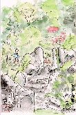東京にはかなり多くの区立公園があり、この目白庭園も池袋駅の北西に位置した豊島区立の小公園で、もとは児童文学者鈴木三恵吉の旧居だそうです。回廊式日本庭園の形をとっており、小さいながらこのように岩を中心としたした滝がしつらえてあり、この絵にはありませんが池に築山や石垣が築かれています。周囲の緑に混じって遅咲きのつつじの朱色が印象的でした。ここは池袋駅からかなり離れた閑静な住宅街の一角で、時節柄来園者は少なかったですが、却って静かなたたずまいを感じることが出来ました。 |